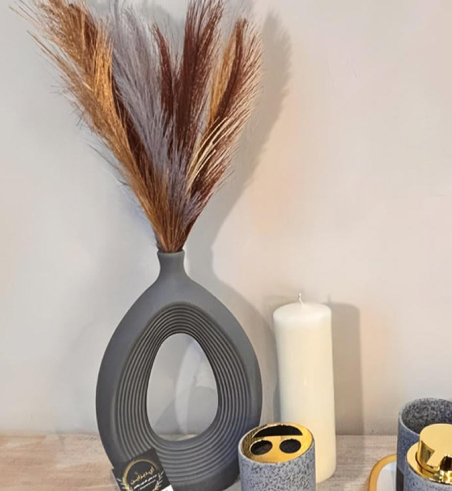 فاز أنيقة بلون رمادي، ذات تصميم بيضاوي وجوفاء من الوسط، مما يتيح إمكانية إضافة الزهور أو الأعشاب.