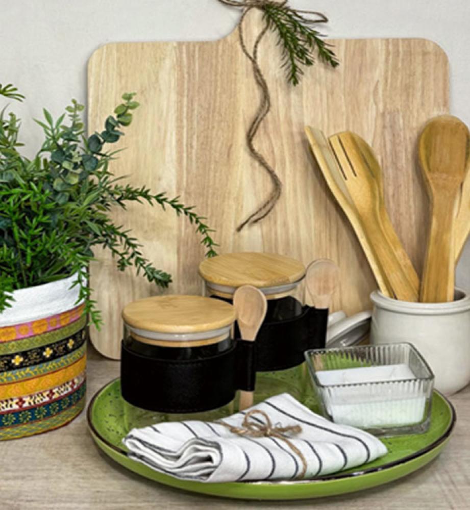 المرطبان الزجاجي يضفي لمسة عصرية على المجموعة. الغطاء الخشبي المغلف بالجلد الأسود يضيف عنصر ملمس متميز. الملعقة الخشبية تكمل المظهر الطبيعي للمجموعة.