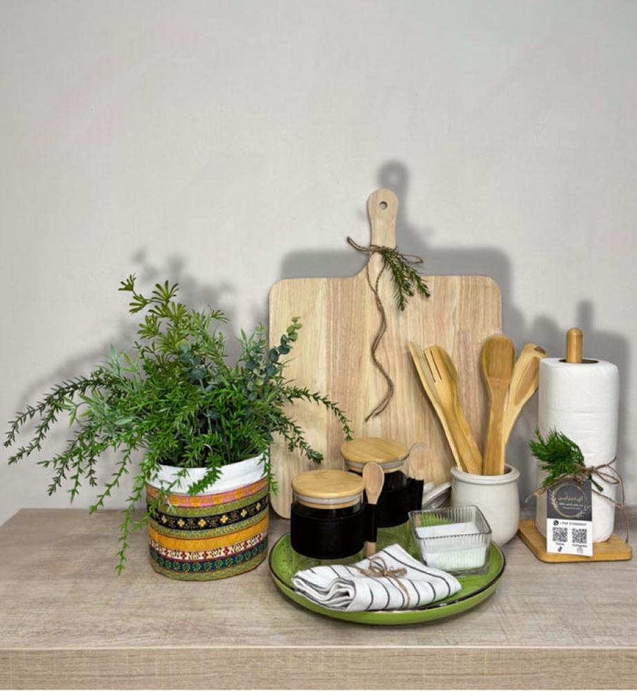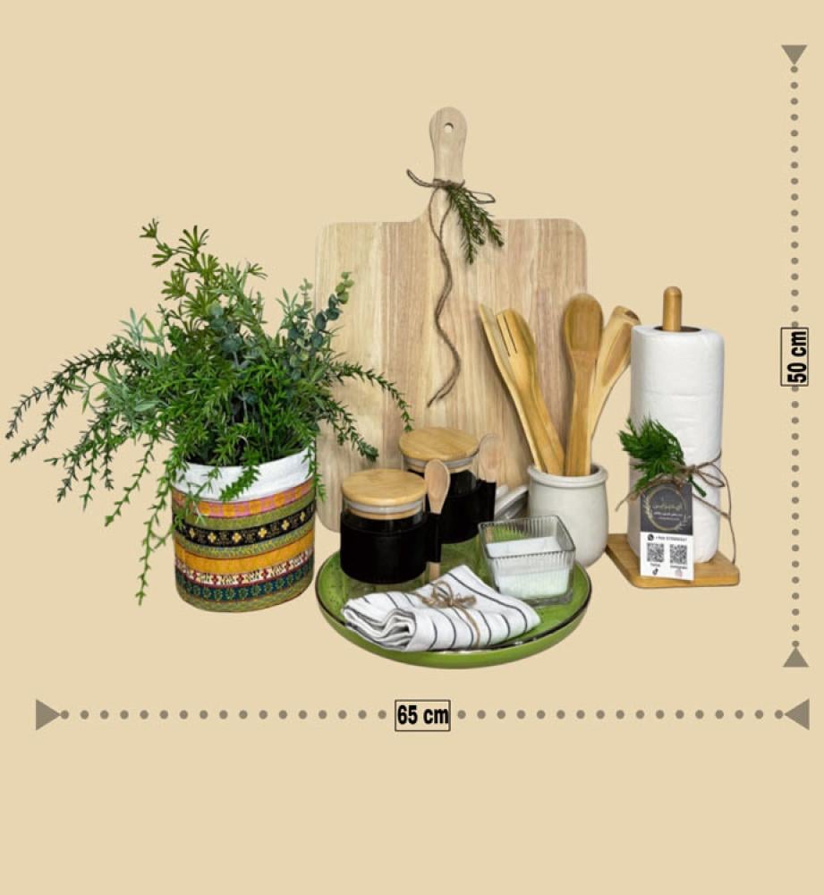 يتميز هذا الديكور بتنوع العناصر التي تجمع بين الاستخدام العملي والجماليات المتناسقة. الألوان الأخضر والأبيض والأسود تشكل لوحة لونية متوازنة، بينما الأقمشة والخشب والسيراميك تضيف تنوعًا في الملمس. النتيجة هي ديكور زاوية مطبخ عملي وجذاب.
