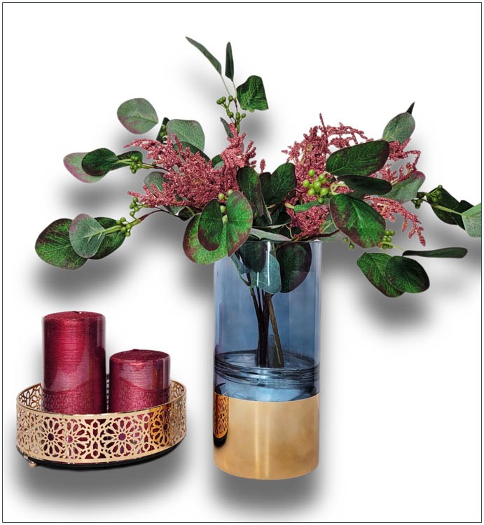 باختيار العناصر المناسبة وتنسيقها بشكل جيد، يمكنك تحويل طاولة الوسط إلى قطعة أثاث فنية تلفت أنظار ضيوفك وتعكس شخصيتك وذوقك الفريد، ولإضافة لمسة أنيقة لتنسيق طاولة الوسط احصل على مجموعة ديكورية بفازة زرقاء وشموع حمراء.