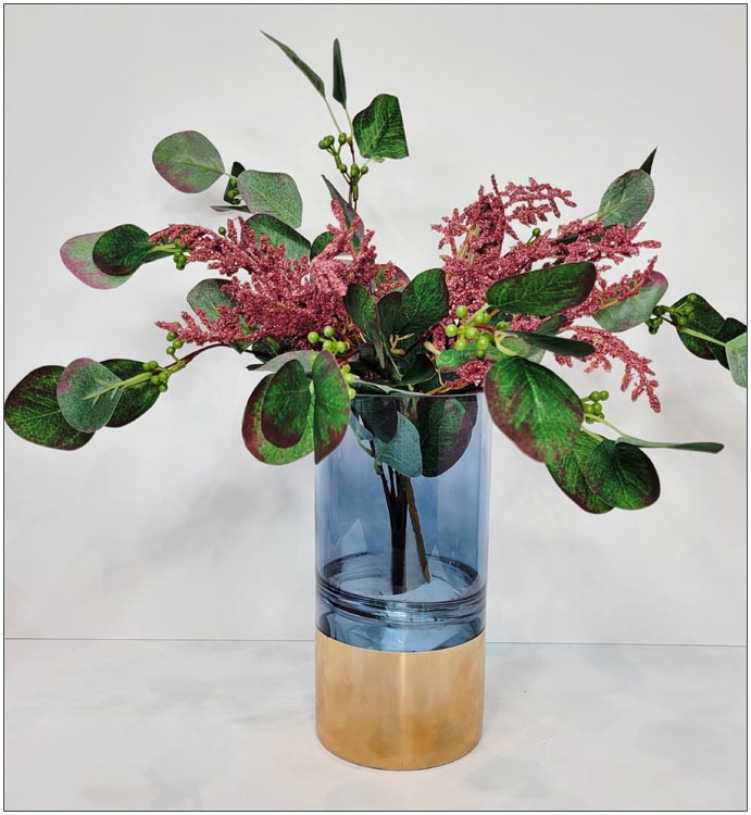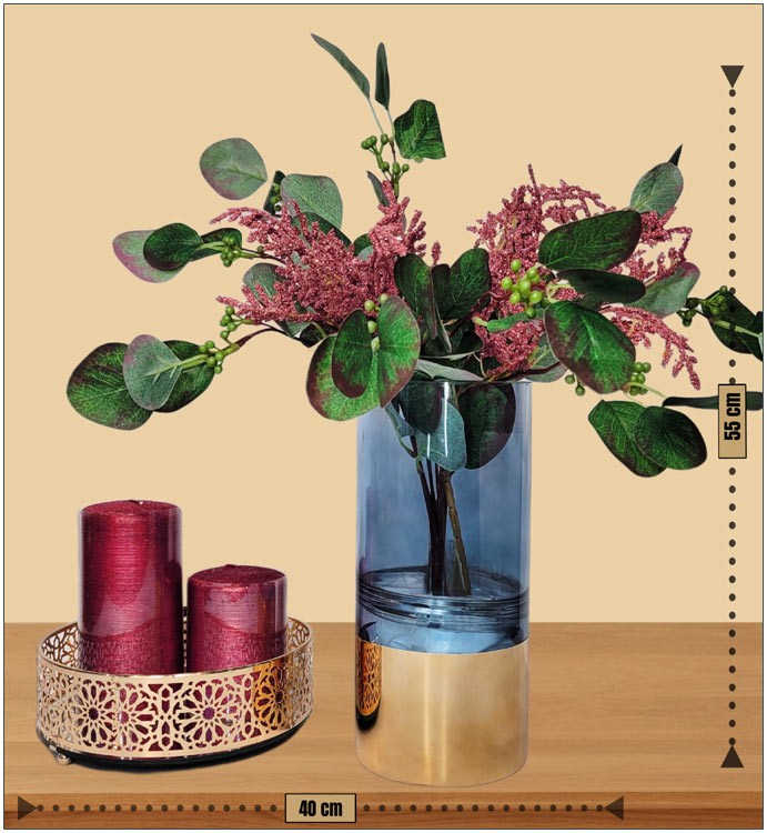 - تحتوي المجموعة على فازة زجاج شفافة بلون أزرق فخم ذو قاعدة ذهبية، تستخدم كقطعة ديكور أنيقة وجميلة لاحتواء النباتات الصناعية.
