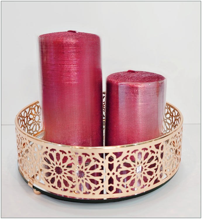 - يوجد أيضًا صينية دائرية بتصميم ولون ذهبي فخم، تستخدم كقاعدة للشموع الحمراء مما يزيد من جمال وفخامة المكان.