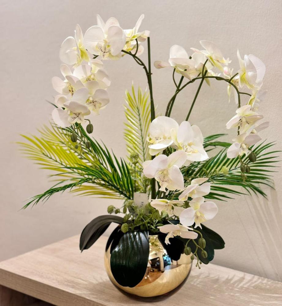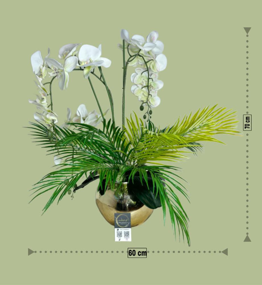 مع فاز كبير ذهبي أوركيد أبيض ستضيف لمسة جمالية مميزة وأناقة طبيعية ساحرة إلى ديكور منزلك، مما يجعله مثاليًا كقطعة ديكور أساسية في أي زاوية أو مساحة داخلية.