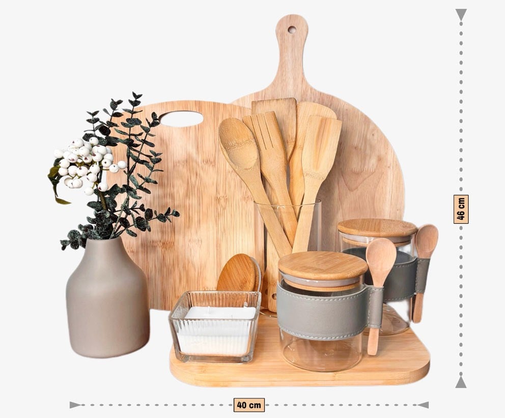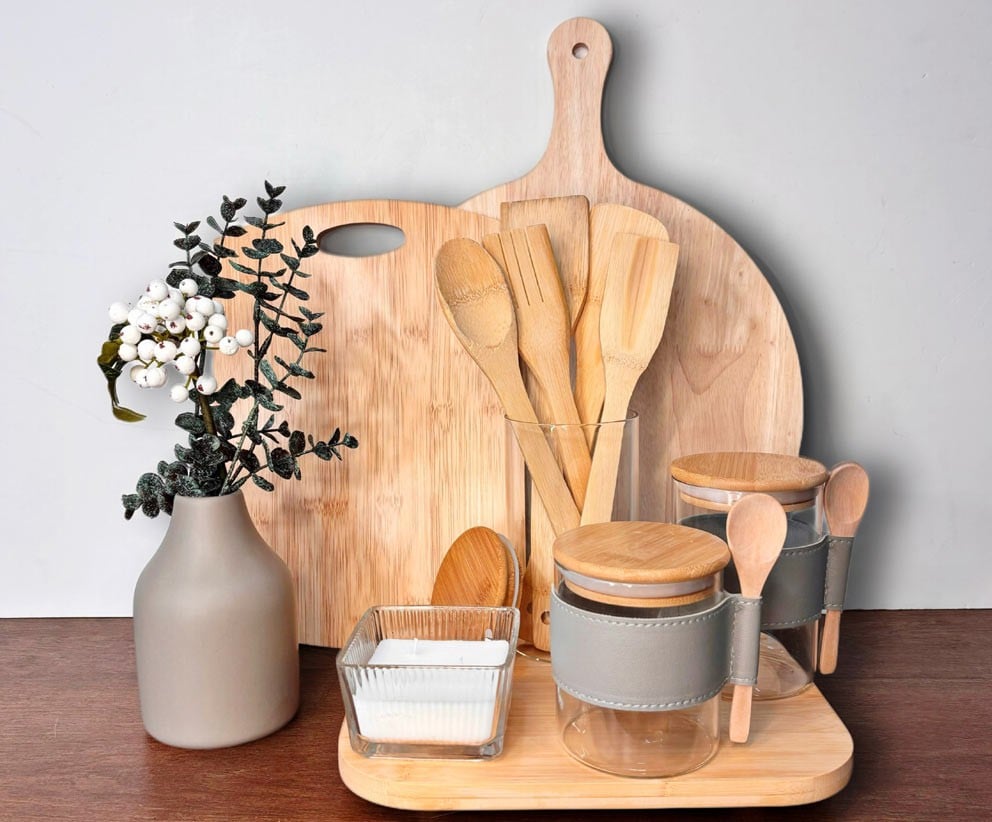 - لمسة طبيعية: تضم المجموعة معالق خشبية وأوراق شجر صناعية تضفي إحساسًا بالطبيعة داخل المطبخ.