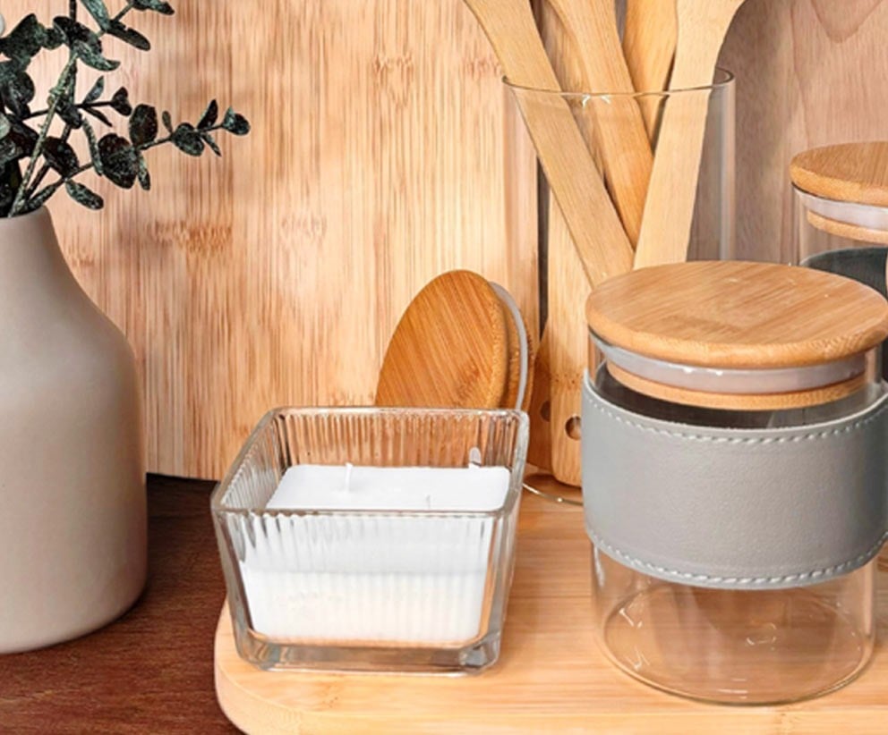 - شمعة معطرة بيضاء في كوب زجاجي مربع: تضفي جوًا منعشًا ومريحًا على المطبخ بفضل رائحتها العطرة وإضاءتها الهادئة.
