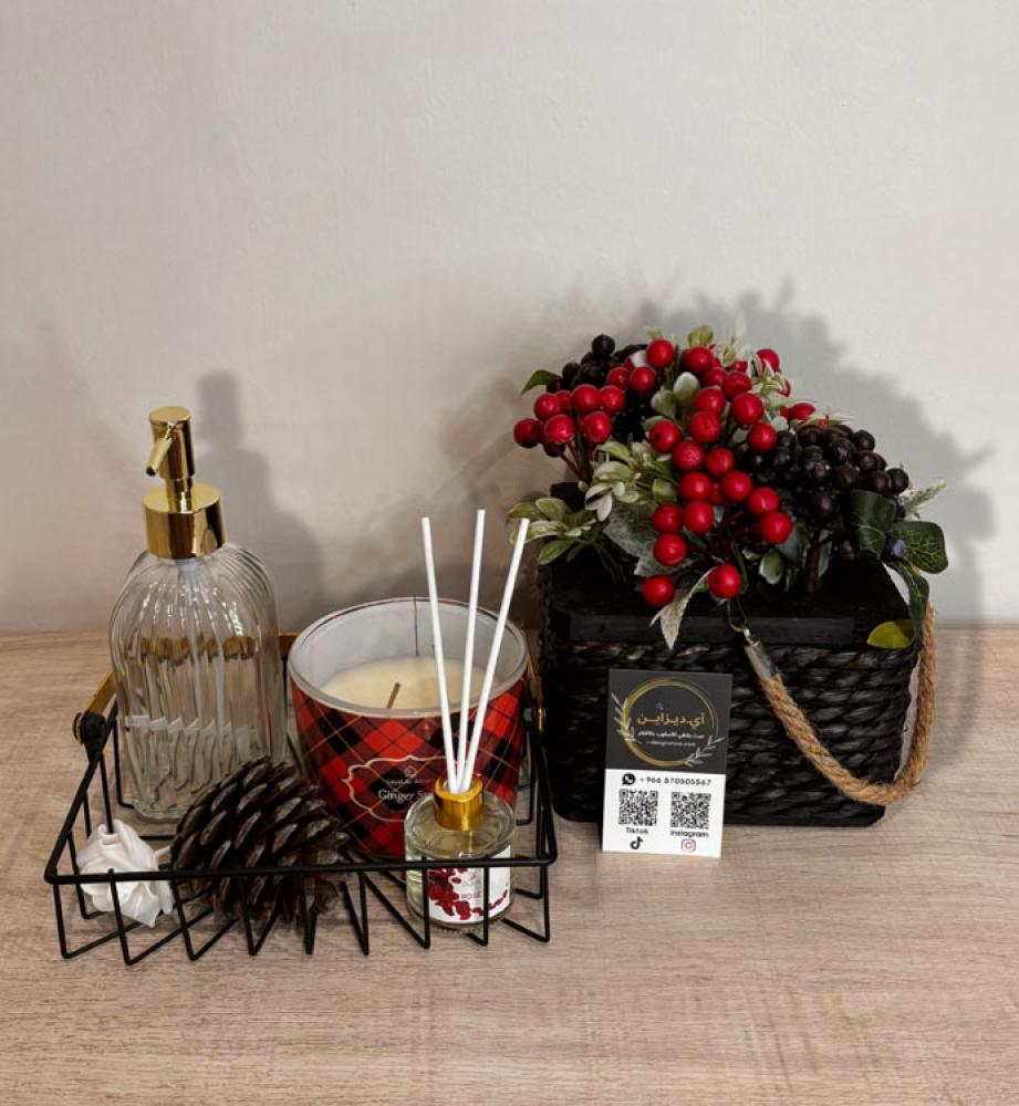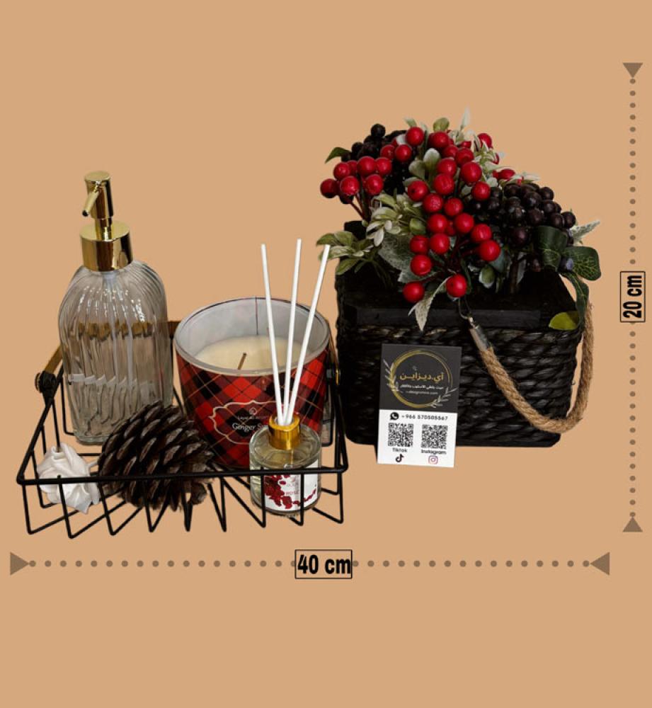 تم ترتيب هذه العناصر بشكل منسق على سلة الحديد السوداء. التباين بين الألوان الأسود والأحمر يُضفي على الديكور طابعًا أنيقًا وجذّابًا.