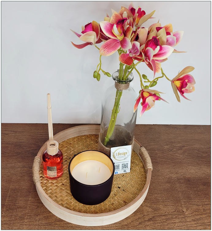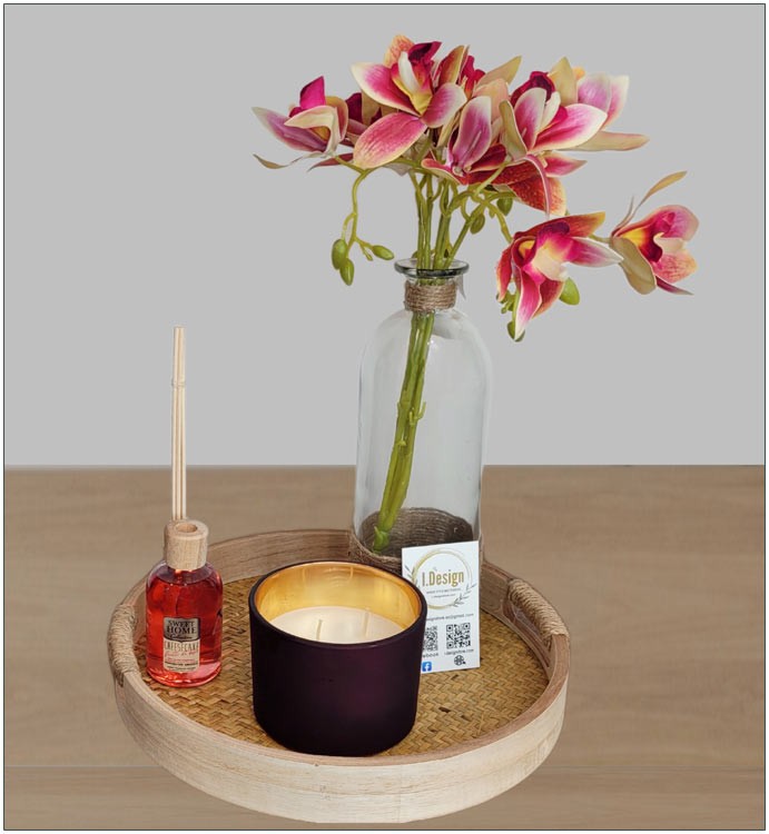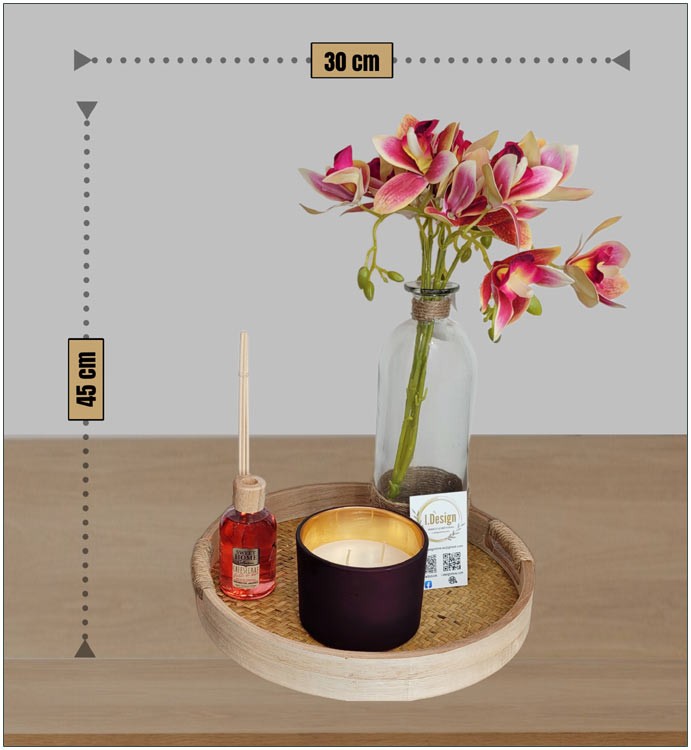 - تضم المجموعة صينية دائرية مصنوعة من الخشب والقش، فيتم استخدامها كقاعدة لباقي عناصر الديكور الأخرى، وذلك لإضافة لمسة من الدفء والطبيعة بشكل يكمل الطابع الريفي للديكور.