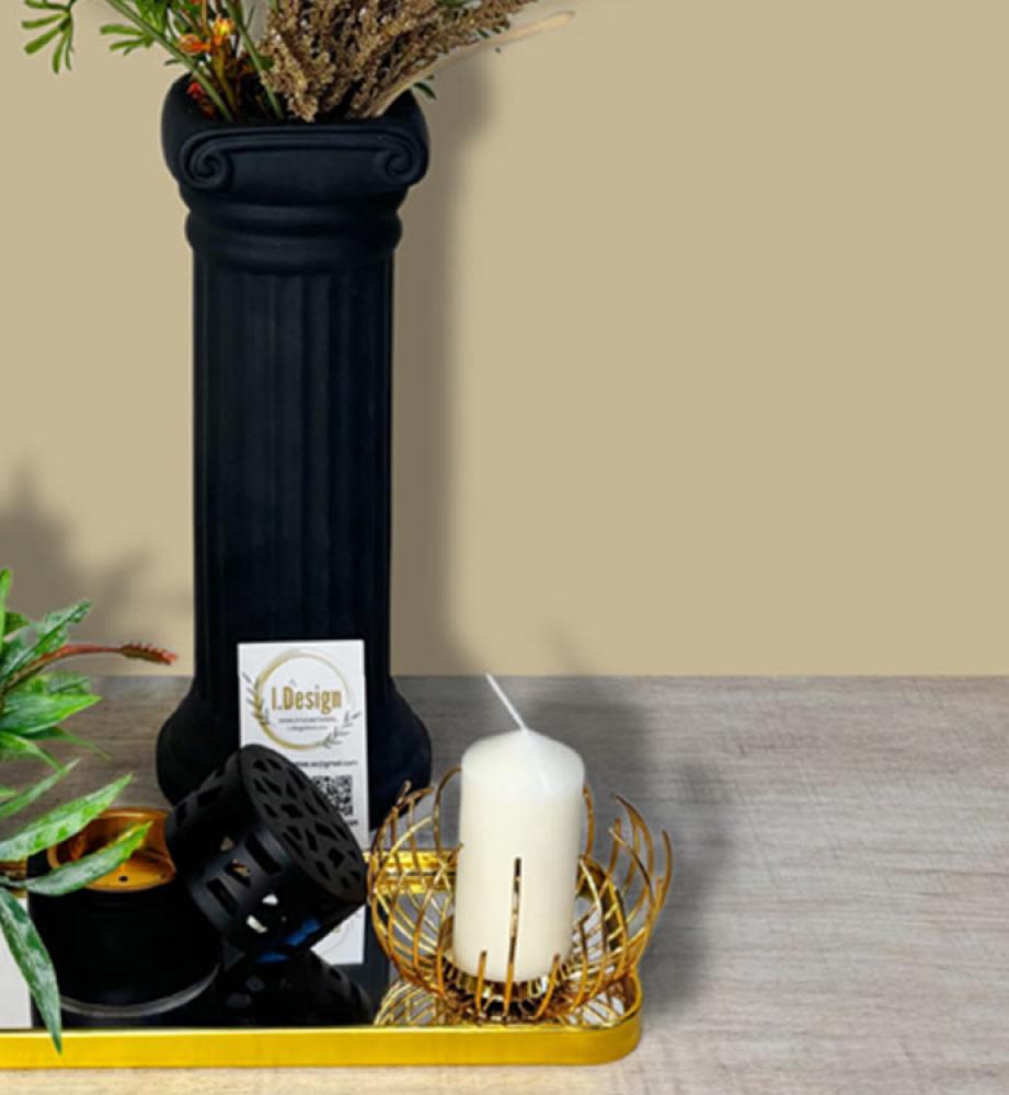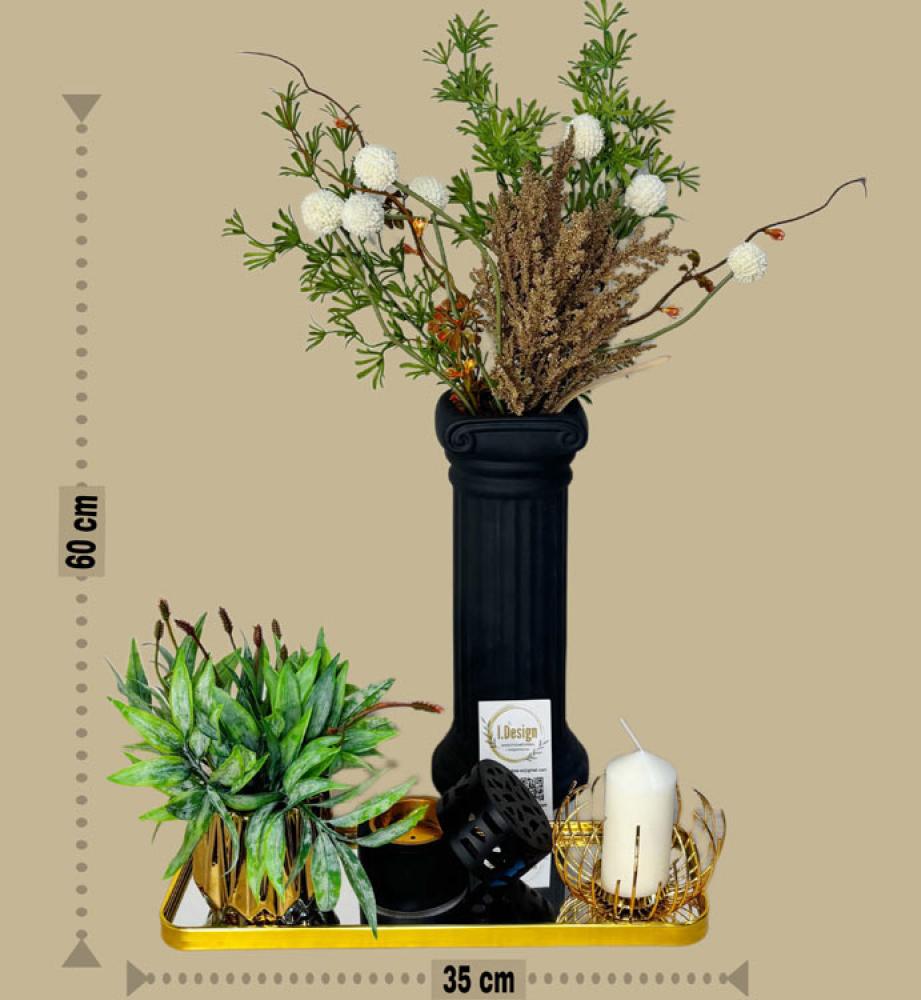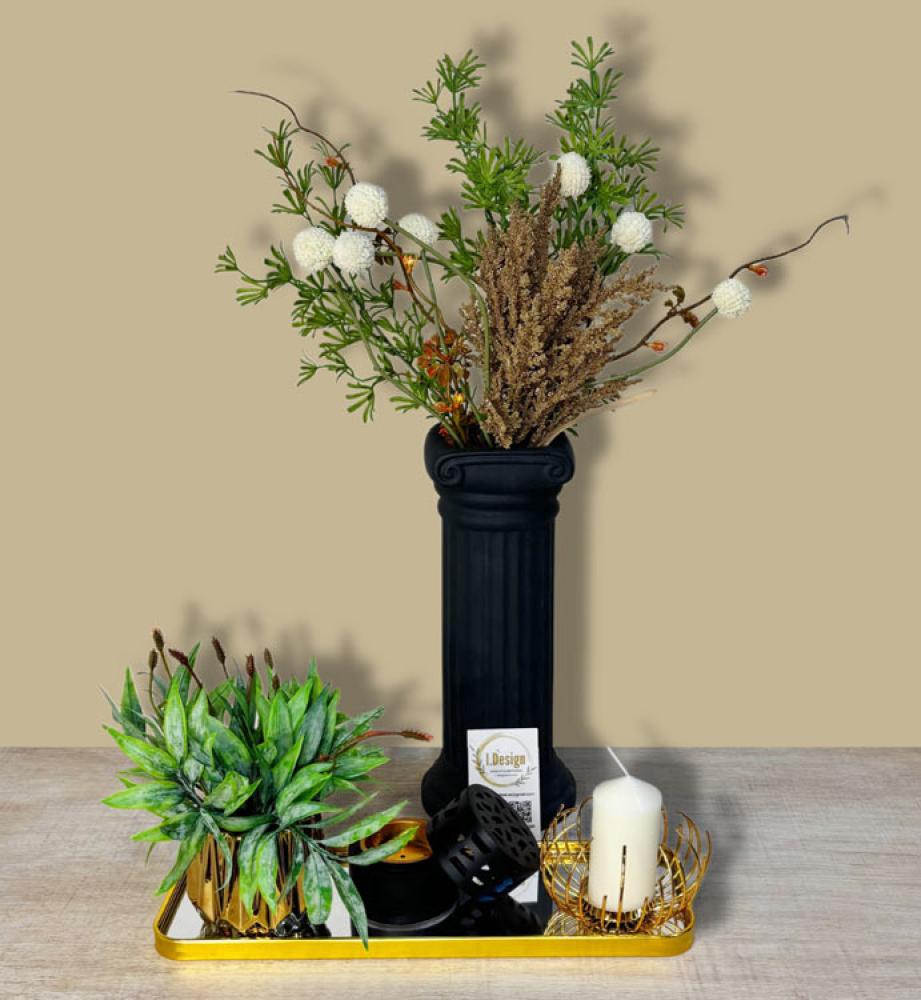 يجمع هذا الديكور بين العناصر الذهبية اللامعة والقطع الأسود الأنيقة، مع إضافة لمسات طبيعية من النباتات والأزهار الاصطناعية. النتيجة هي تصميم راقي وعصري يمكن استخدامه كديكور جذاب لطاولة زاوية.