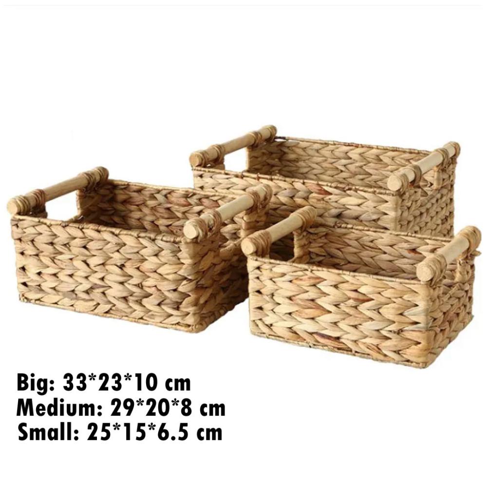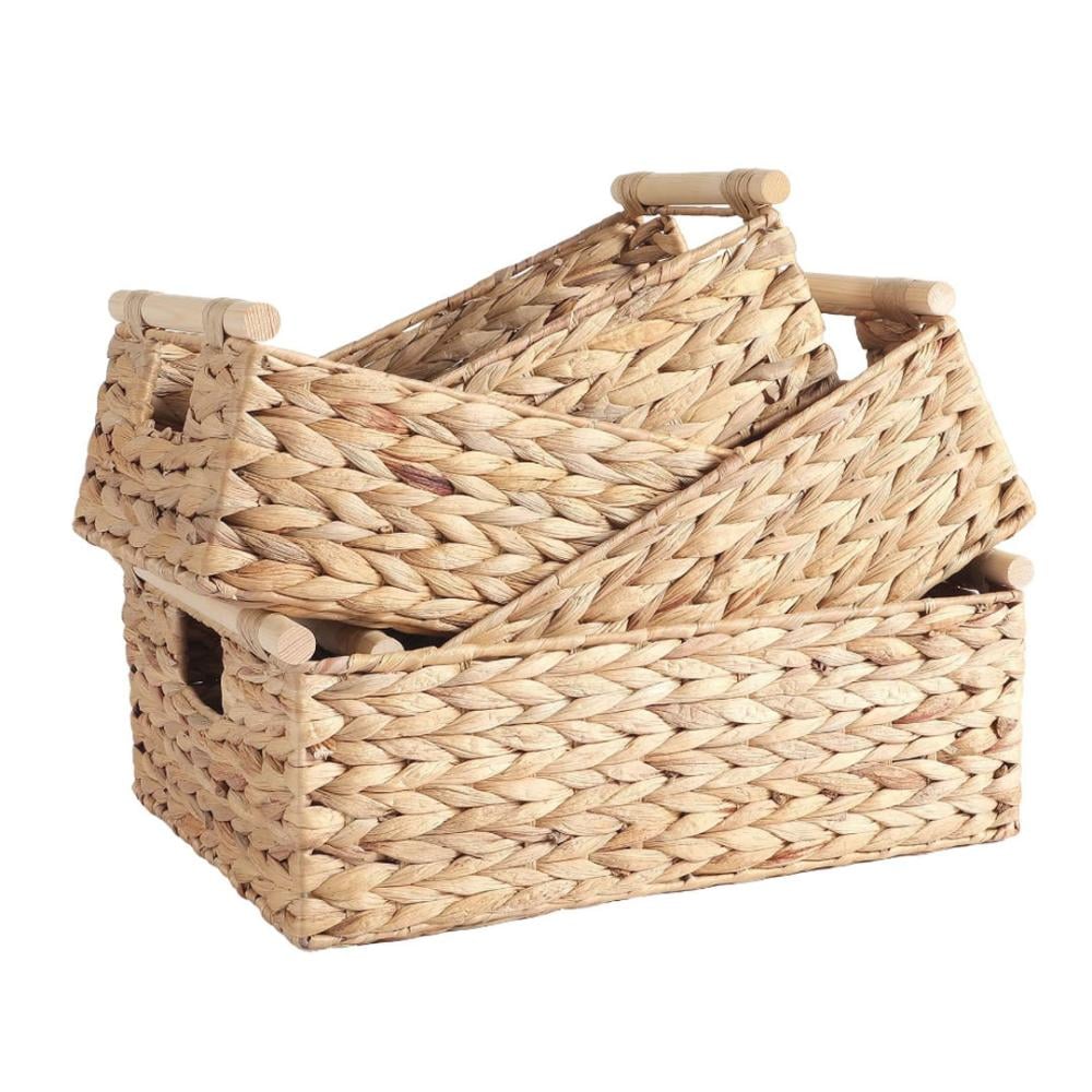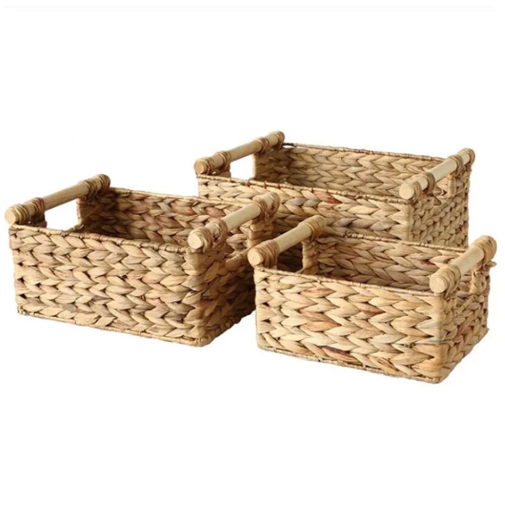 طقم سلل تخزين مستطيلة عدد 3 قش مع مسكات من الخشب