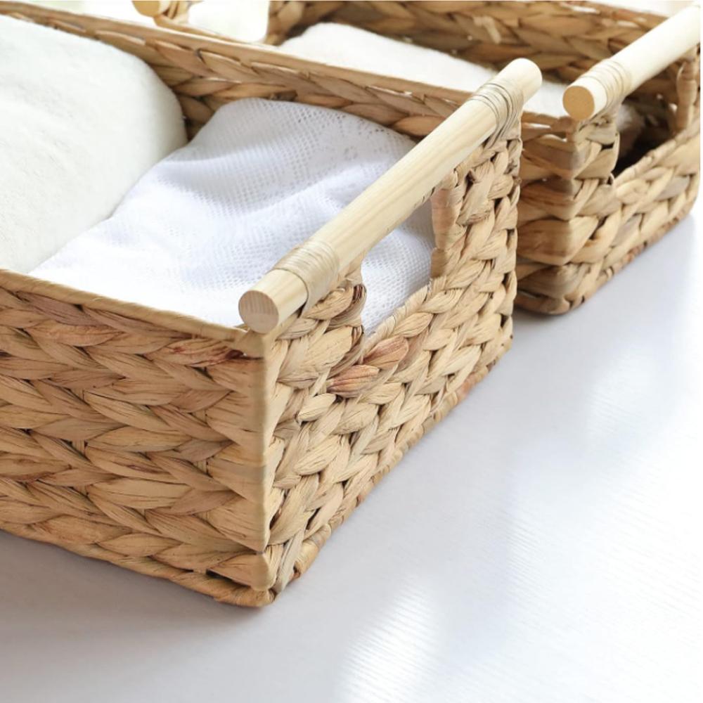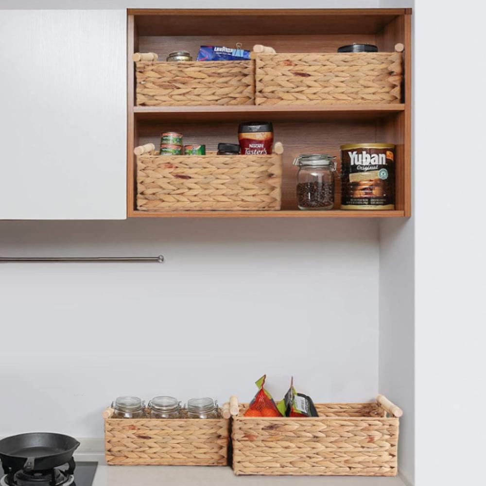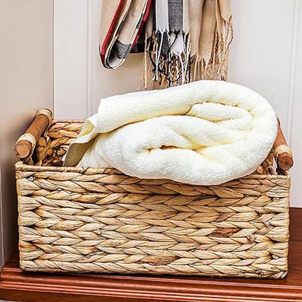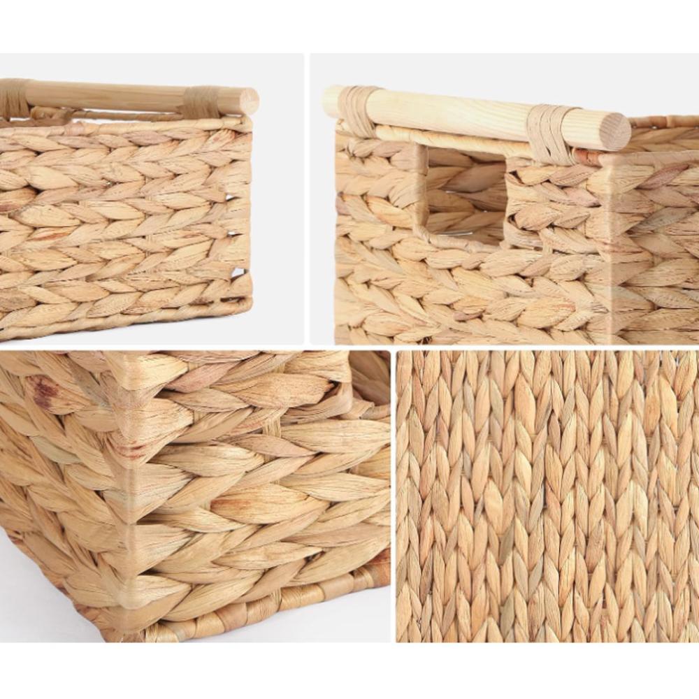 طقم سلل تخزين مستطيلة عدد 3 قش مع مسكات من الخشب