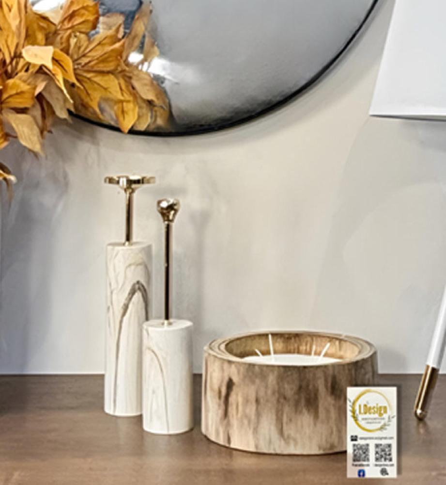هذا الطقم الجميل من الشمعدانين يُكمل التصميم بإضفاء لمسة من الرقي والأناقة. الألوان الدافئة والتصميم المنسجم يجعلان هذه القطعة تتناغم بشكل رائع مع بقية ديكور المدخل.