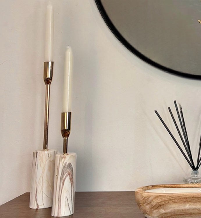 يعزز الأناقة والفخامة في المدخل. يتكون من قطعتين من الشمعدانات الرخامية، بألوان بيج وبني، وتوضع شموع بيضاء طويلة داخلها لإضفاء جو رومانسي ودافئ.