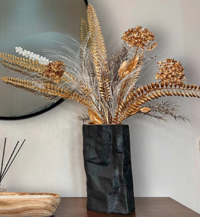 يتم وضعها داخل الفاز المستطيل. تعطي لمسة من الطبيعة والأناقة، حيث تتميز الأوراق والأغصان والورود الاصطناعية باللون الذهبي الجميل، وتتناغم مع الريش الأبيض لتكوين تركيبة مثالية.