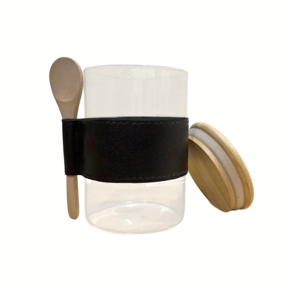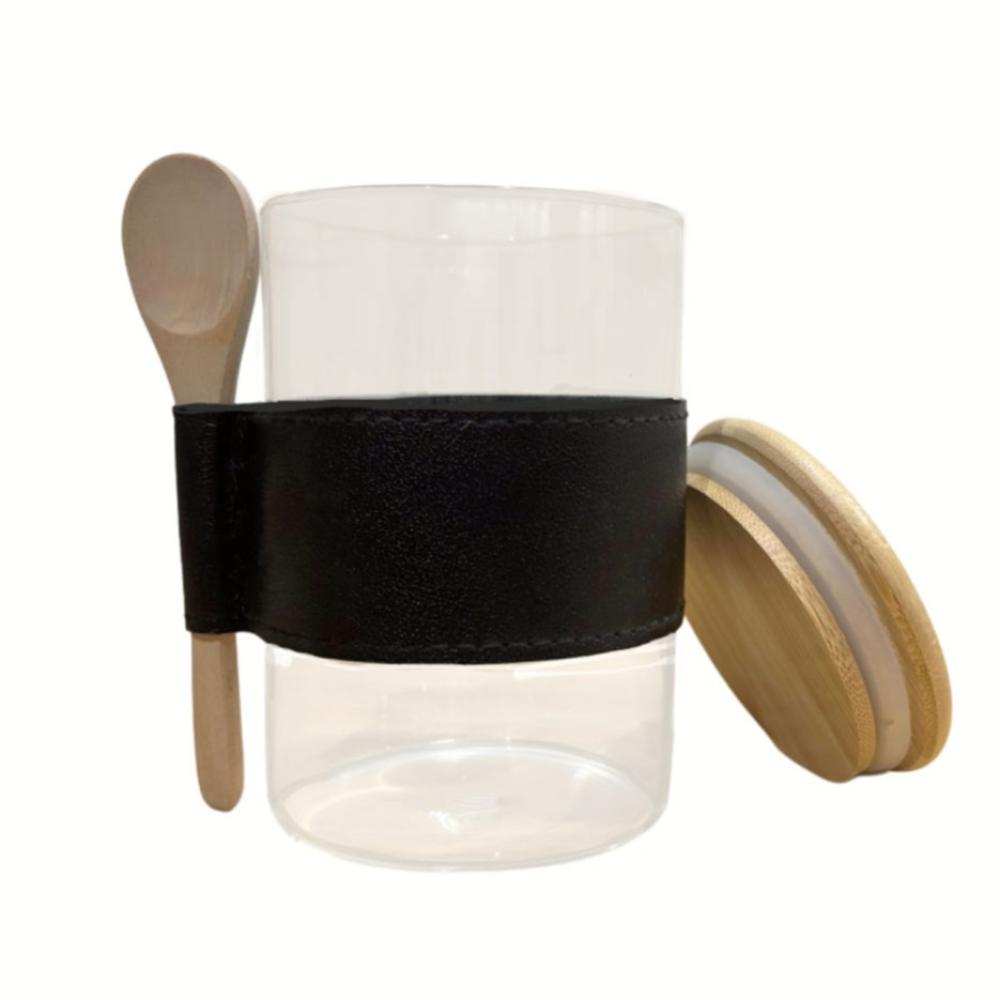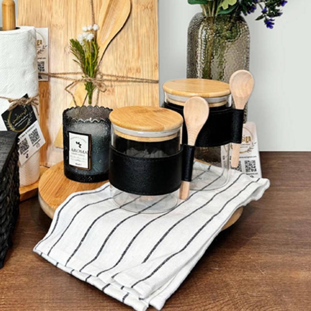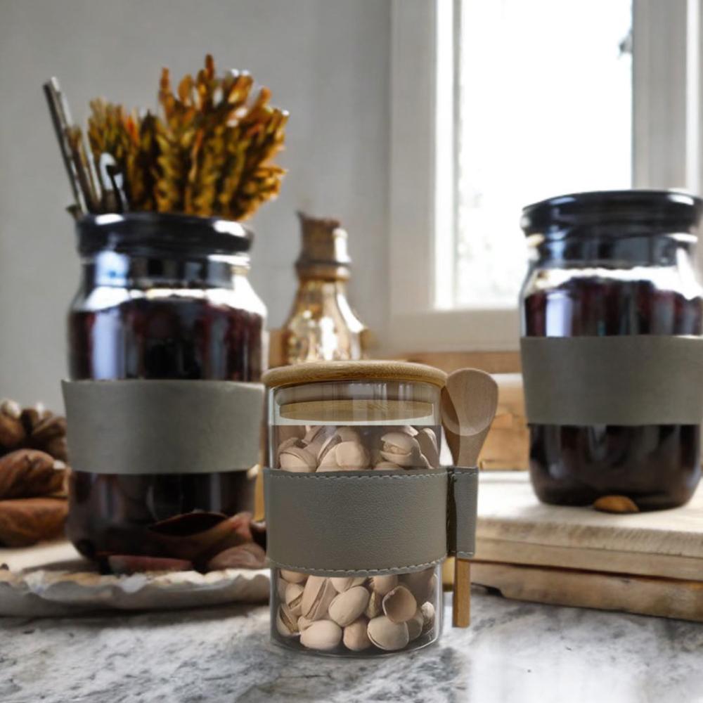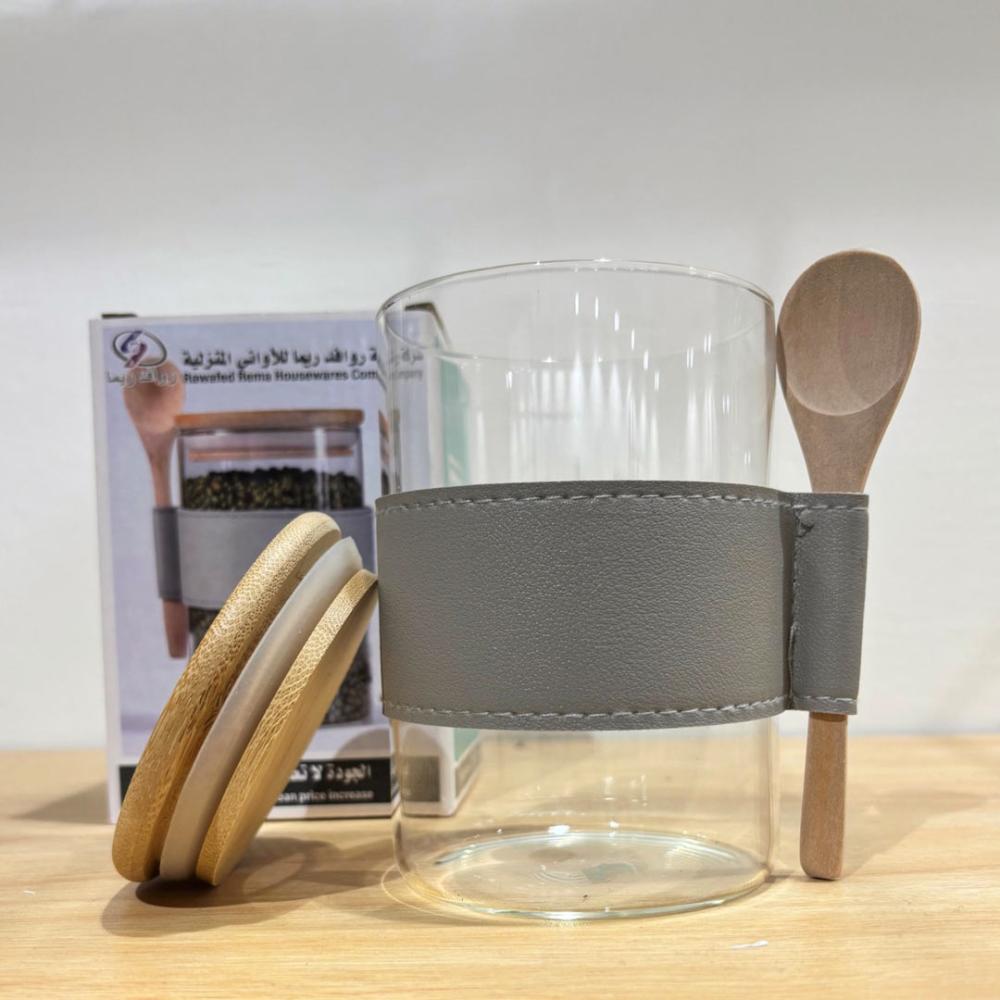 إذا كنت تبحث عن برطمان زجاج بغطاء خشبي وجلد بني مع ملعقة خشبية، فهو خيار مثالي يجمع بين الأناقة والعملية في التخزين.
