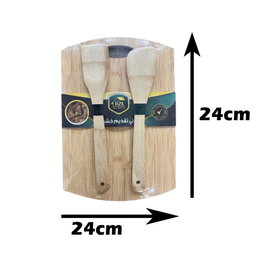 لوح تقطيع خشبي مع ملعقتين خشب مقاس 24 × 24 سم هو إضافة مثالية لأي مطبخ.