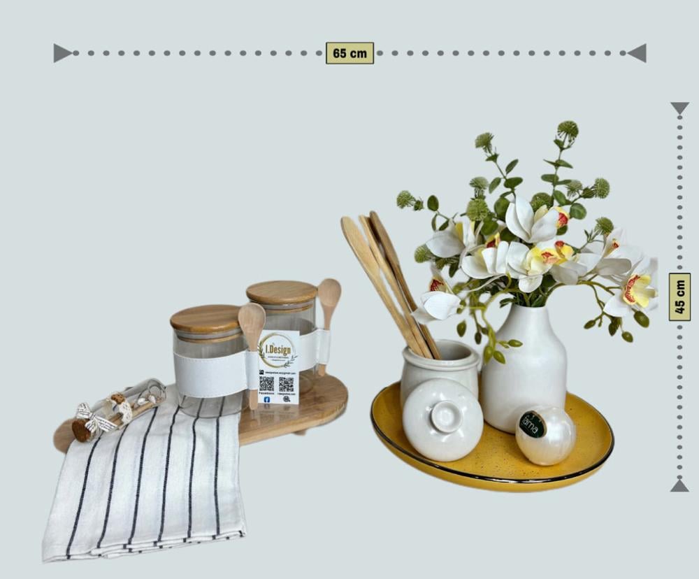 هذه المجموعة الديكورية متناغمة ومتكاملة بألوانها الحيادية والأصفر الدافئ، وتوفر توازناً بين القطع العملية والزخرفية في تصميم متناسق وأنيق.