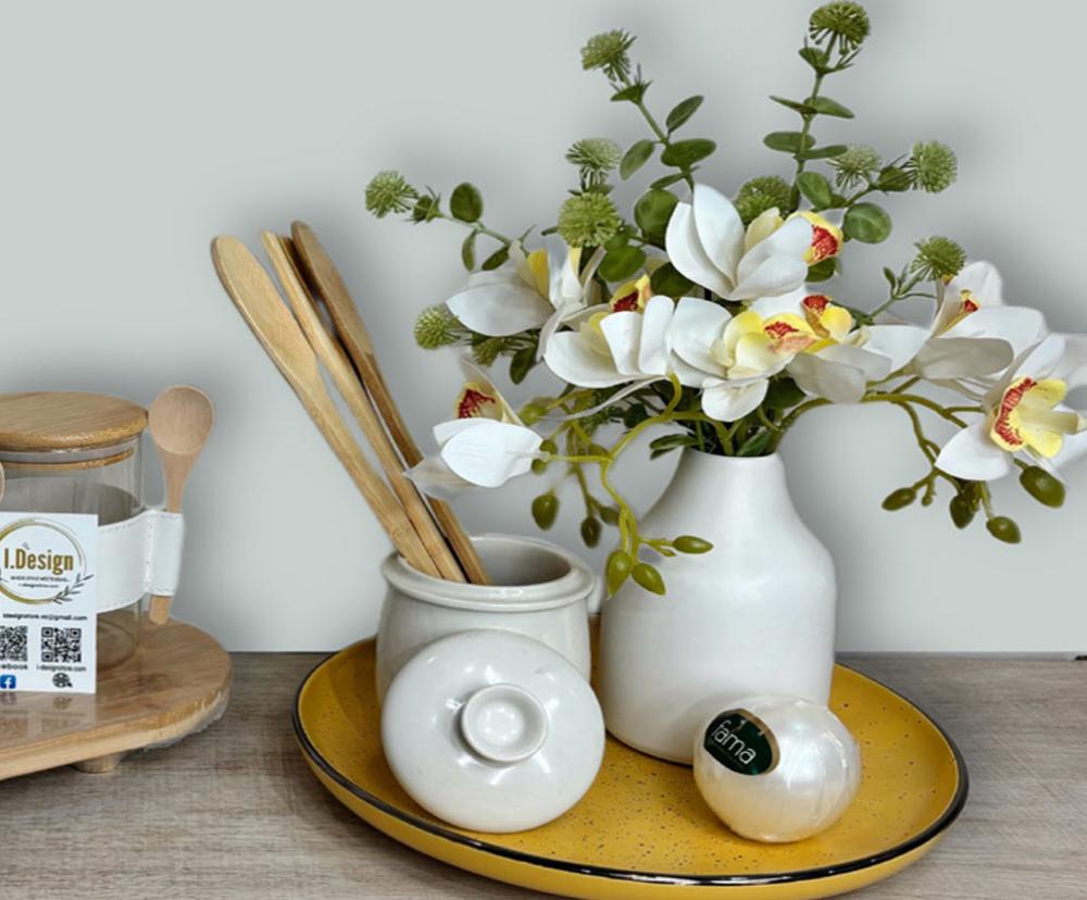 - الصحن السيراميكي الأصفر اللون هو القطعة المركزية لهذه المجموعة والتي سيتم وضع باقي العناصر عليها.