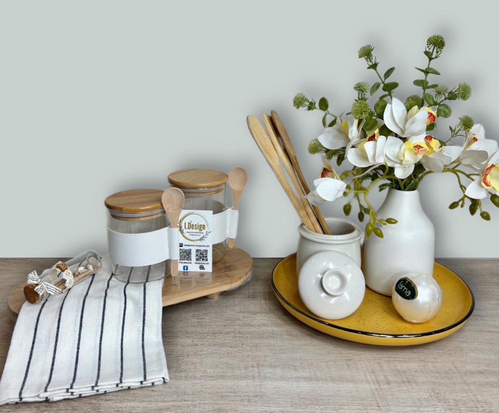 - المرطبانان الزجاجيان مع الغطاءات الخشبية والإطارات الجلدية البيضاء هي قطع أنيقة ووظيفية لتخزين التوابل.