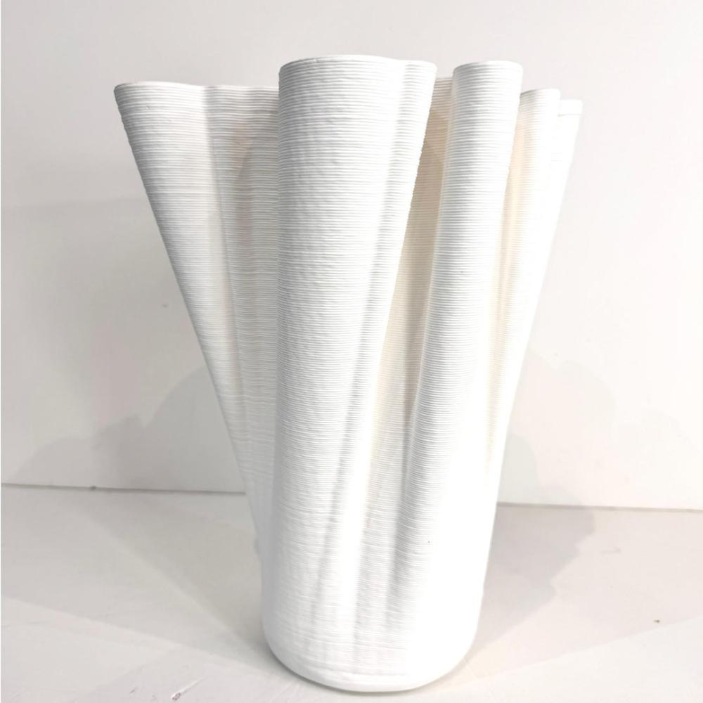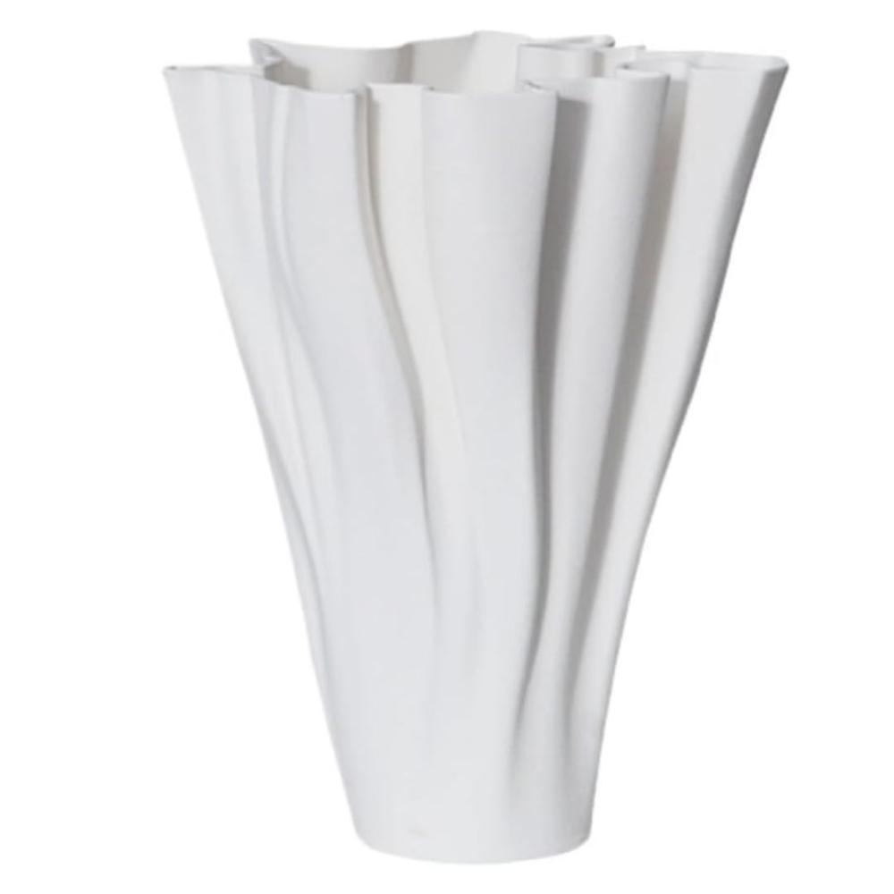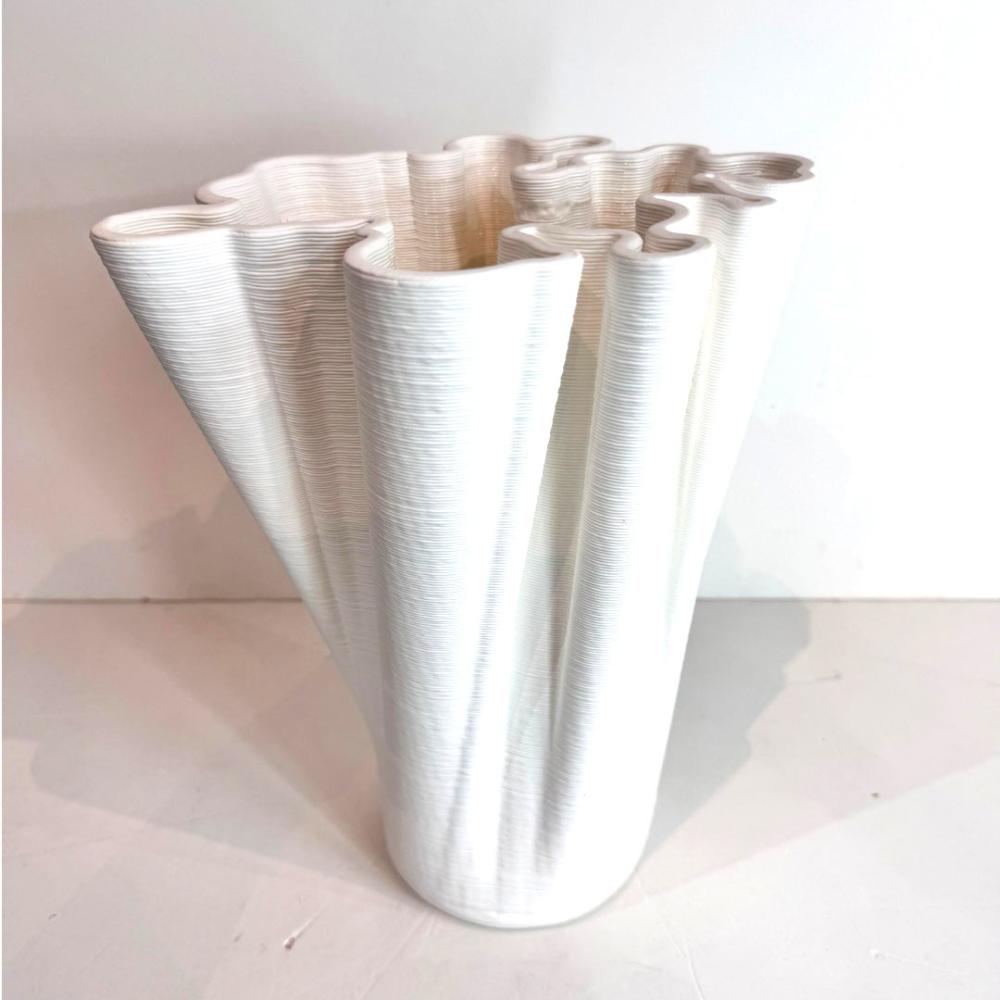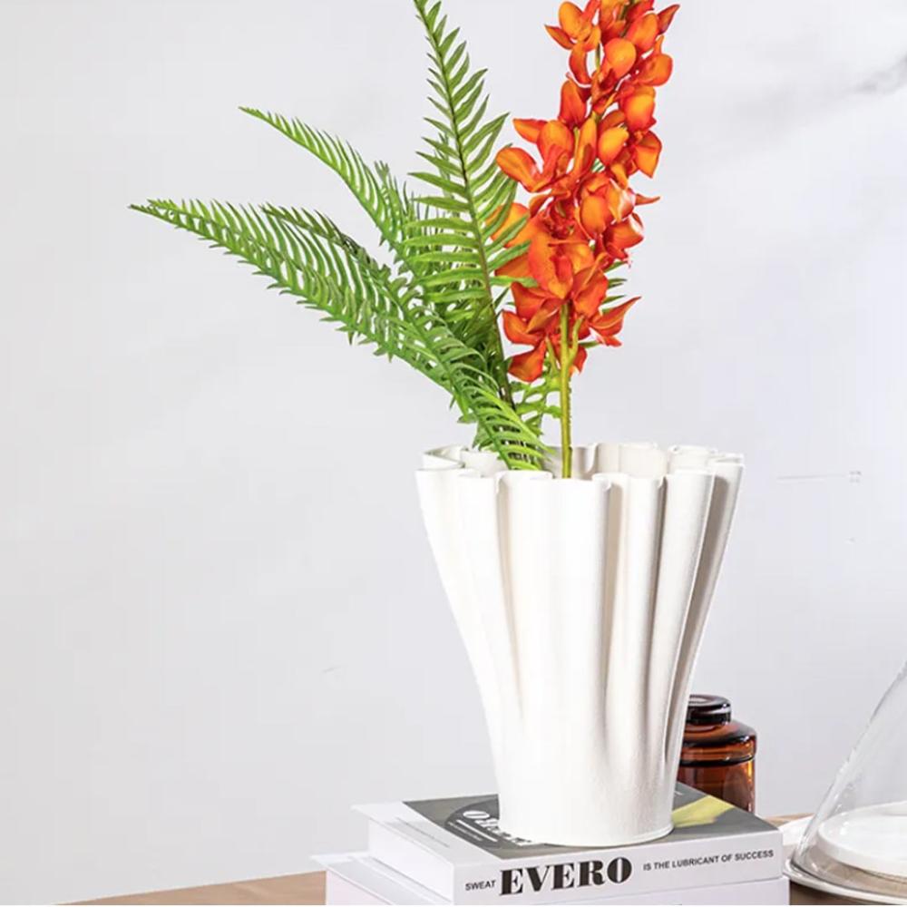 المزهرية البيضاء المعرجة على شكل صدفة طويلة مصنوعة من الخزف الأبيض، وتتميز بتصميمها الفريد الذي يجمع بين الأناقة والعصرية.