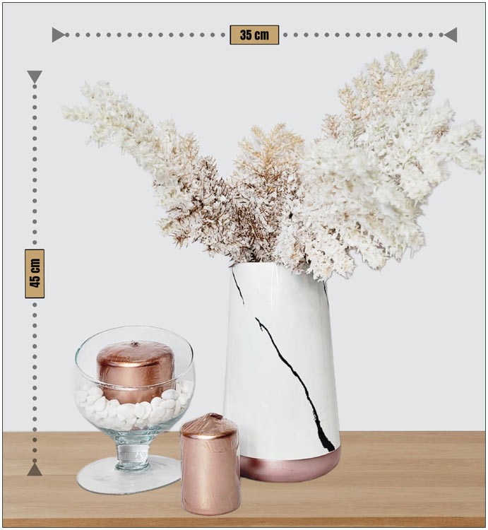 - وجود فازة سيراميك بلون أبيض وقاعدة برونزية مع خط أسود يساعد على تزين طاولة الوسط بشكل رائع.
